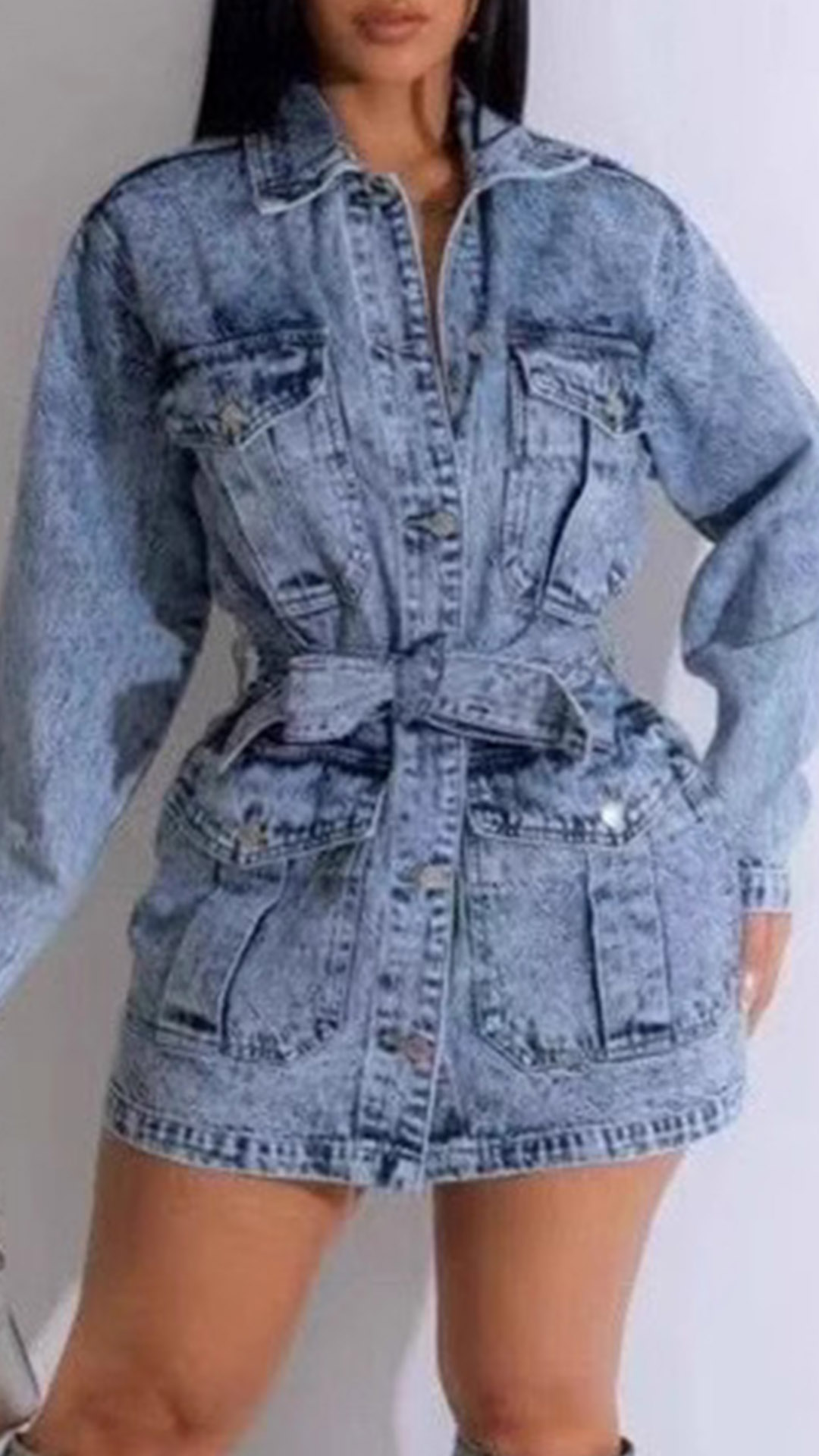 Get that effortlessly cool street style look with this denim dress. The old-washed denim gives it a vintage and worn-in vibe, perfect for a laid-back and casual outfit. The patch pockets add a touch of utility and style, while the self-tie belt cinches in the waist for a flattering silhouette. Pair this denim dress with sneakers or boots for a chic and trendy ensemble that is perfect for everyday wear.