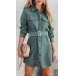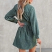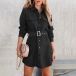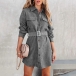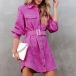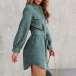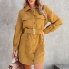 Street Fashion Stand Collar Patch Pockets Long Sleeve Buttoned Self-tie Corduroy Shirt Dress