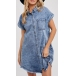 Street Fashion Stand Collar Short Sleeve Patch Pockets Front Button Frayed Hemline Denim Dress
