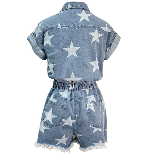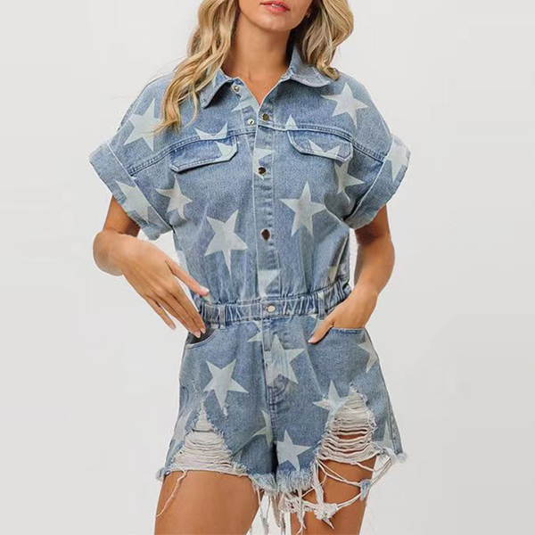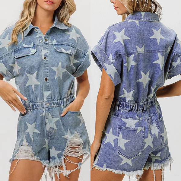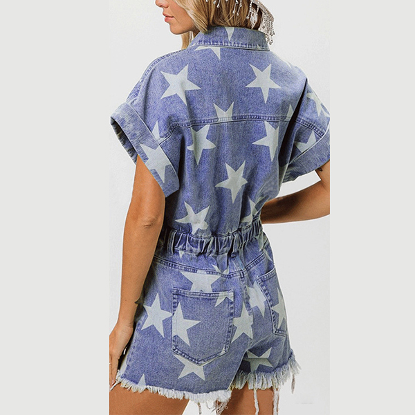 Make a bold statement with this Star Printed Denim Romper. This edgy and fashionable romper features a unique star print, a stand collar, short sleeves, an elastic waist, and distressed denim, creating a street-style look that's sure to turn heads. The stand collar can be worn buttoned up for a sleek appearance or left open for a more relaxed and casual look. Hope you like it.