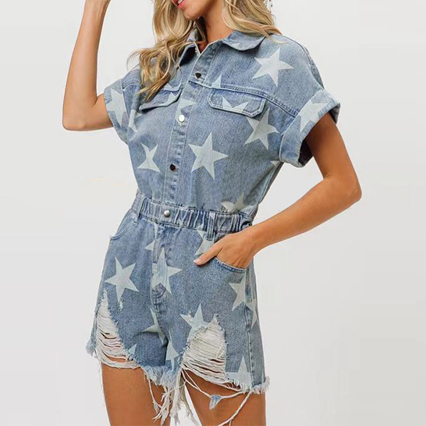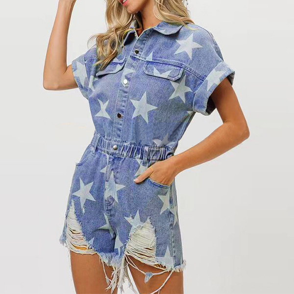 Street Fashion Star Printed Stand Collar Short Sleeve Elastic Waist Distressed Denim Romper