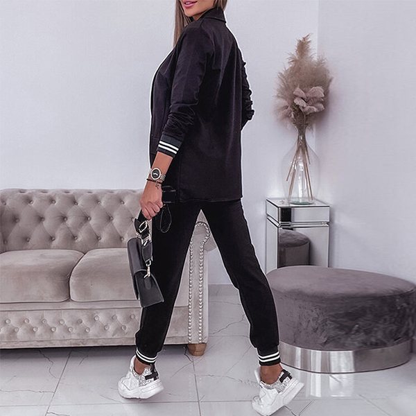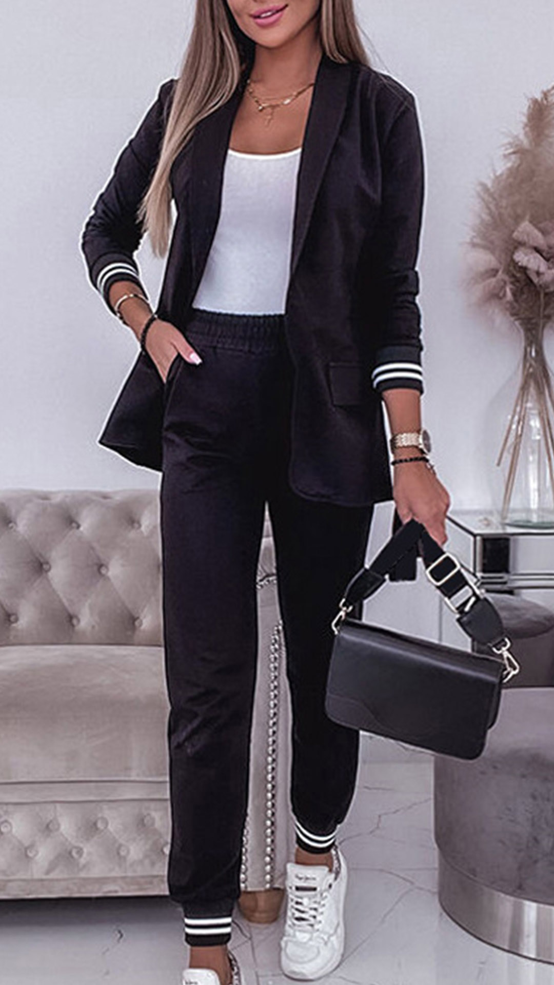 The set includes a blazer and pants, allowing for versatile styling options. The blazer features a classic cut with a modern twist. And the stripe printed along the sleeve cuff make it looks chic and stylish. The pants has elastic waist and cuff. Also, stripe printed along the cuff. It is perfect for both casual and semi-formal occasions.
