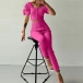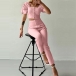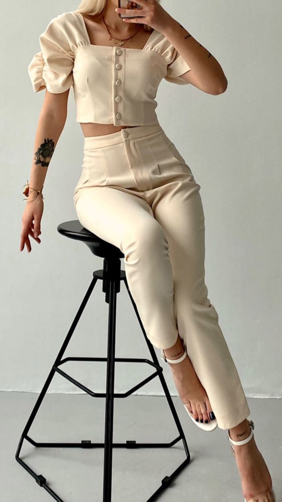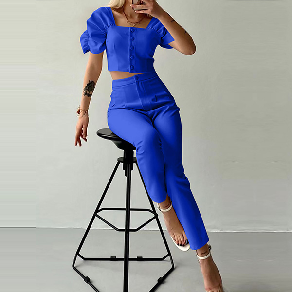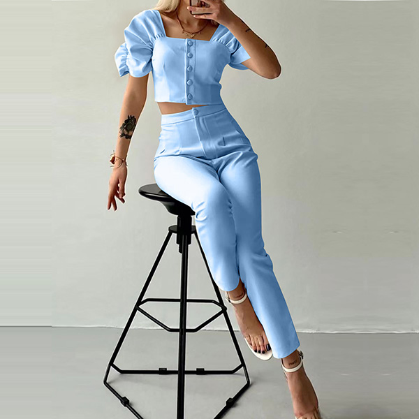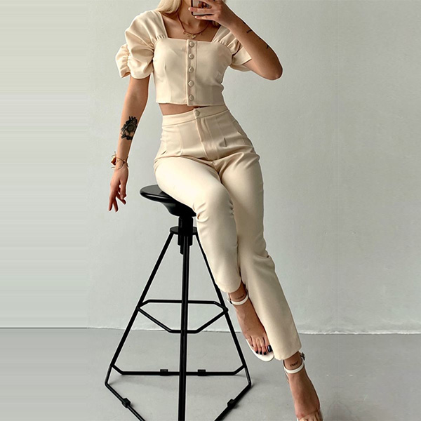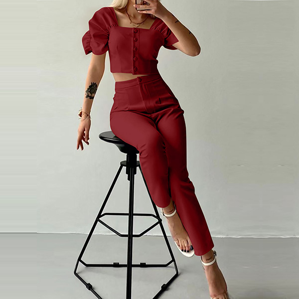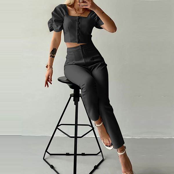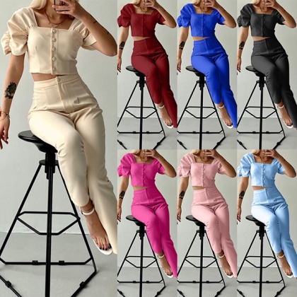 This contemporary two-piece ensemble features a fashionable crop top paired with straight-cut pants, creating a stylish and on-trend street-style look. The crop top features puff short sleeve and front button design. The straight-cut pants provide a sleek and streamlined silhouette. Multi-colors avabile.