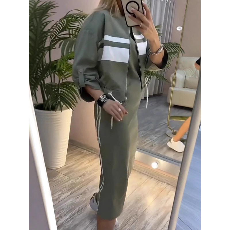 This coordinated ensemble delivers urban sophistication through complementary piece construction for versatile contemporary styling. The jacket component offers structured coverage with street-inspired details that enhance the overall ensemble sophistication. The dress element delivers foundational styling with coordinated construction that harmonizes with the jacket through shared design language. Hope you like it.
