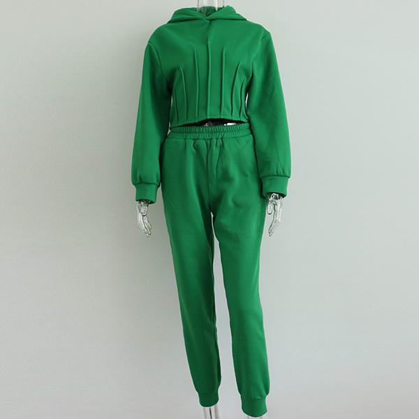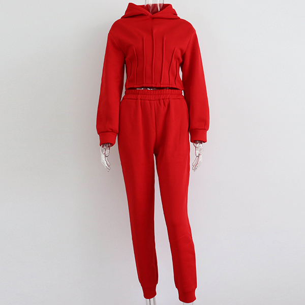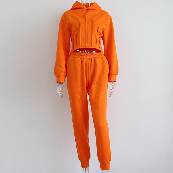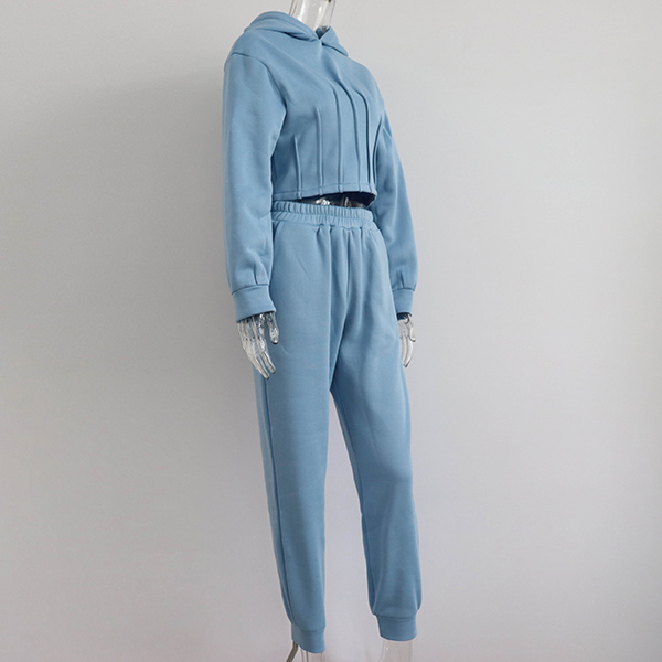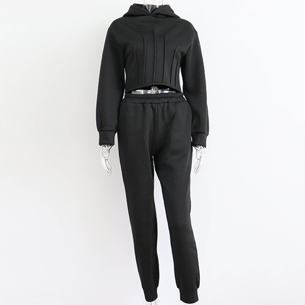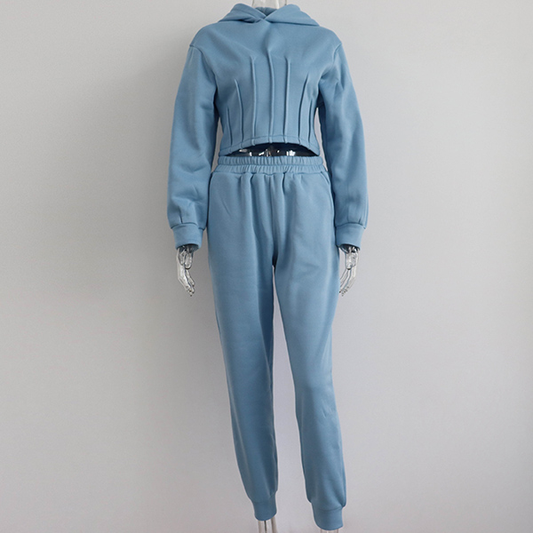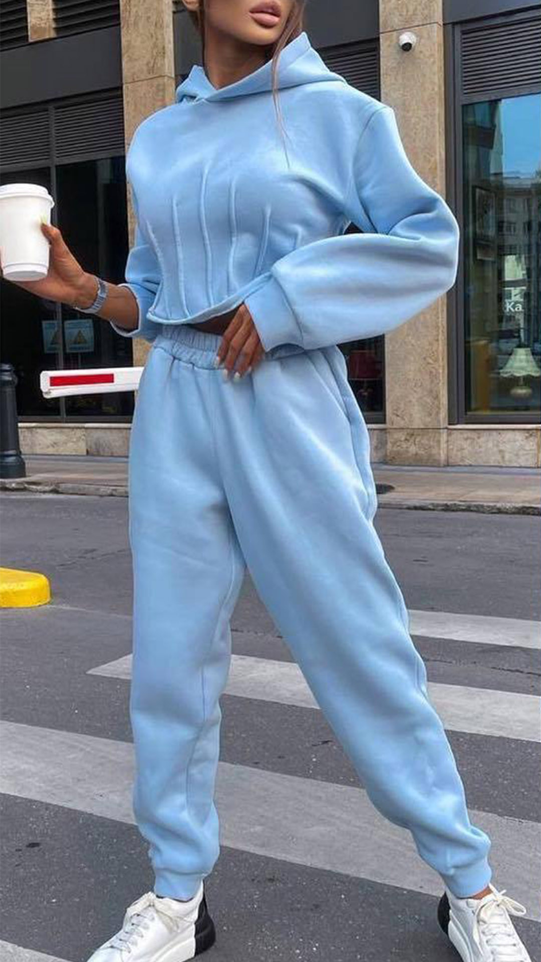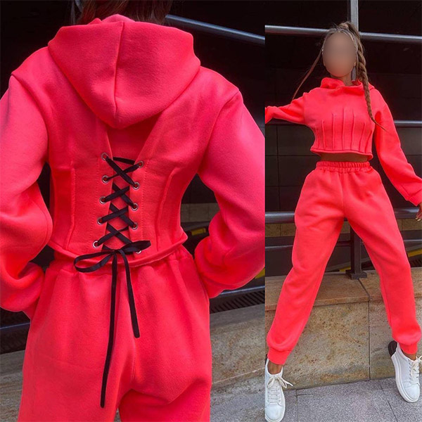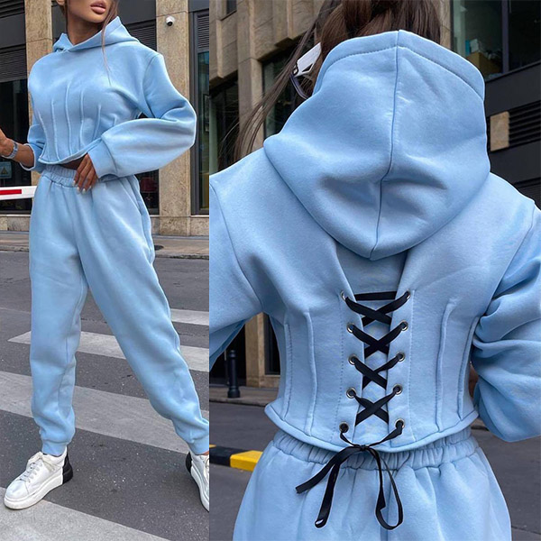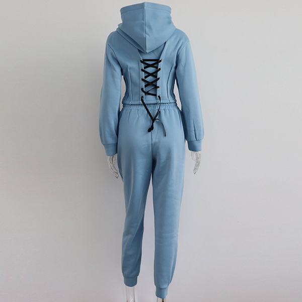 This sporty two-piece set creating a stylish and coordinated outfit. The hoodie sweatshirt features a back lace-up detail, adding a trendy and edgy element to the design. The sweatpants match the hoodie and provide comfort and flexibility with an elastic waistband. This two-piece set offers a fashionable yet comfortable look, perfect for streetwear-inspired outfits or casual occasions.