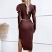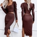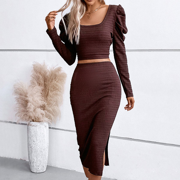 This set is designed to make a bold fashion statement while keeping you comfortable and chic. It is crafted with soft and breathable fabric, ensuring a comfortable fit all day long. The Slit Skirt is designed with a slit, adding a hint of allure and sophistication to your look. And the crop top with puff sleeve add some cute and sweet element to this set, wanna have a try?