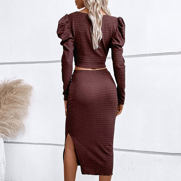 Street Fashion Two-piece Set Consist of Puff Sleeve Crop Top and Slit Skirt