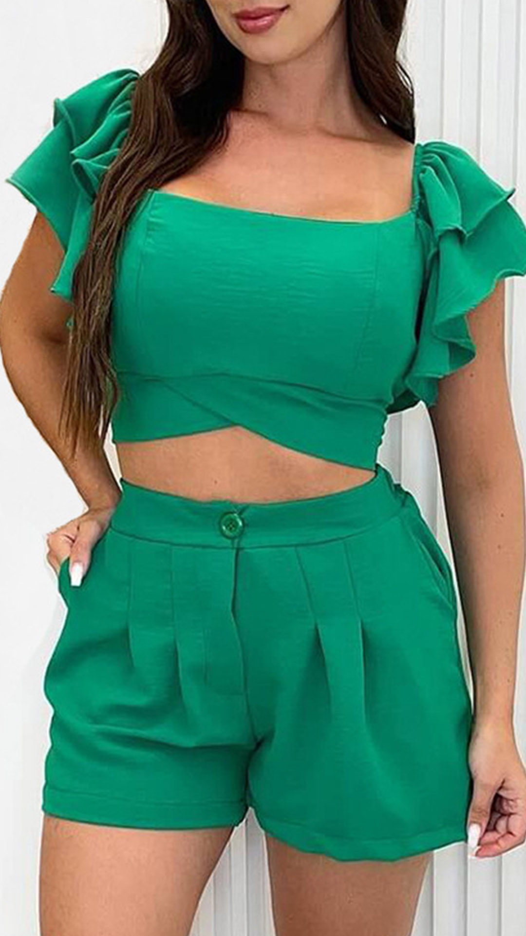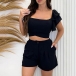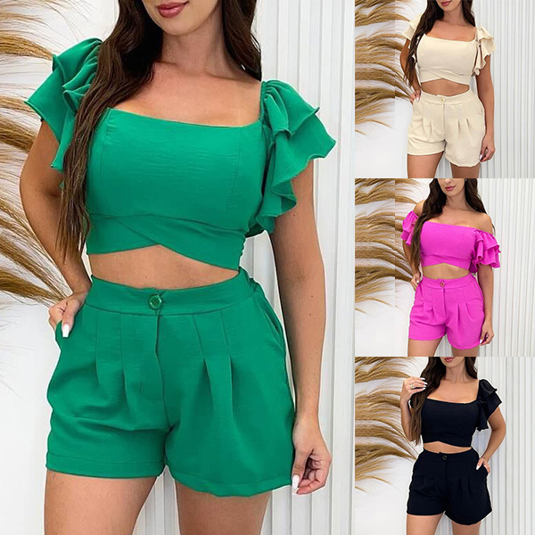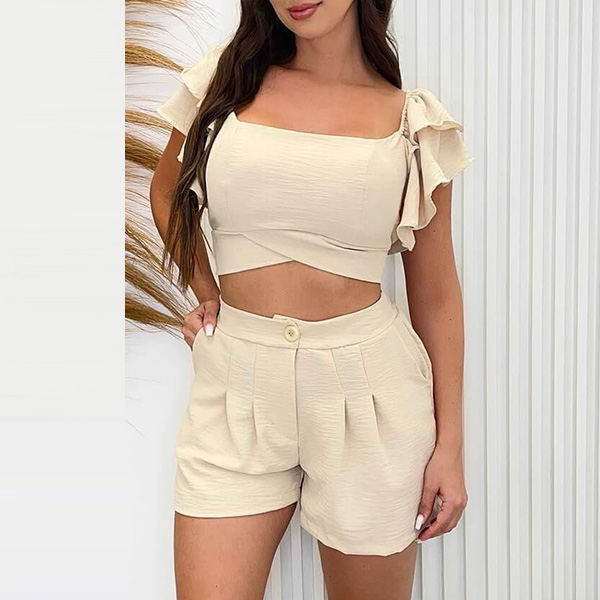 This Street Fashion Two-piece Set is perfect for those who want to make a statement with their fashion choices. The crop top features a flattering square cut neckline and ruffled short sleeve adding a playful and feminine touch to the overall design. And the short is a high-rise with pleated along the waist! It is made from a soft and breathable fabric that will keep you cool and comfortable, making it perfect for hot summer days.