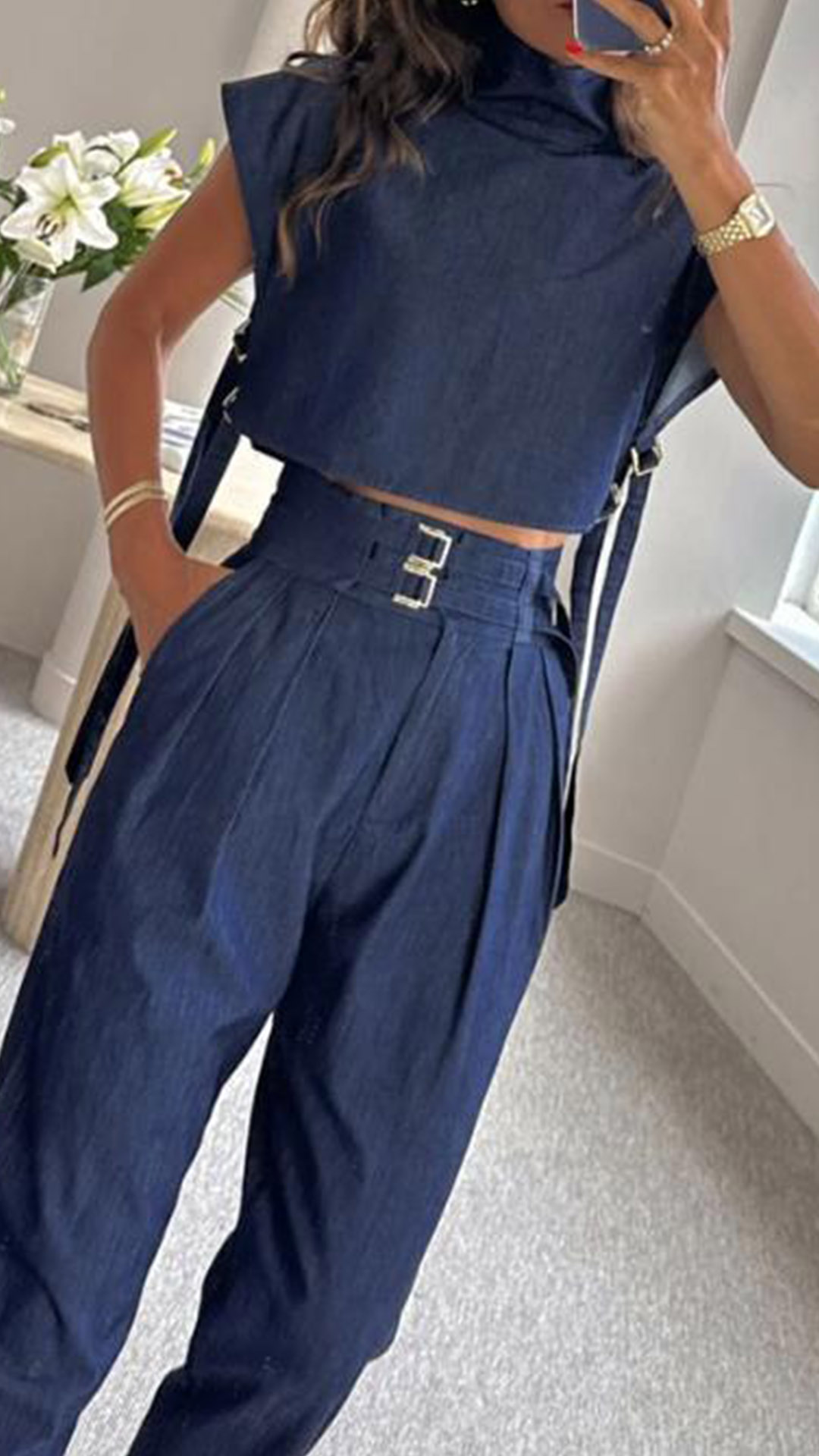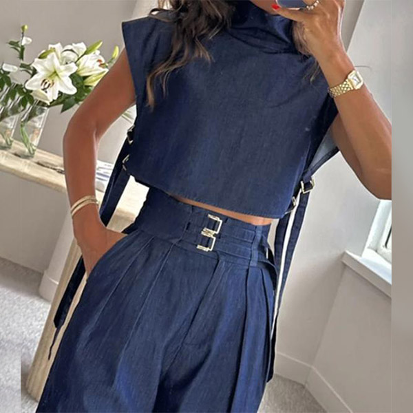 Elevate your street style with this stylish two-piece set that effortlessly blends modern sophistication and urban edge. Consisting of a turtleneck crop top and sleek, belted pants, this coordinated outfit is the perfect choice for the fashion-forward individual.