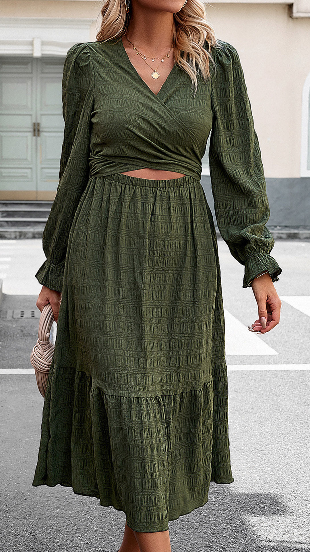 This dress effortlessly combines modern street style with feminine elegance. The V-neckline and long sleeves create a flattering silhouette, while the front cutout adds a chic and edgy flair. The self-tie detail adds a unique touch and allows for adjustable fit and customization. Made from high-quality fabric, this midi dress offers both comfort and style.