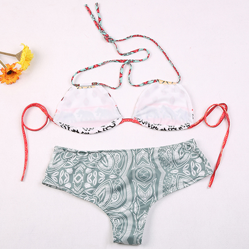 bottom is also printed with abstract prints. What's more, the bikini top is styled with self-tie halter