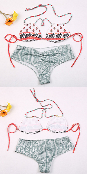 The bikini top of this bikini set is printed with elephants and other abstract prints while the bikini