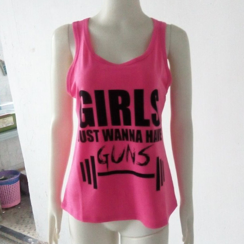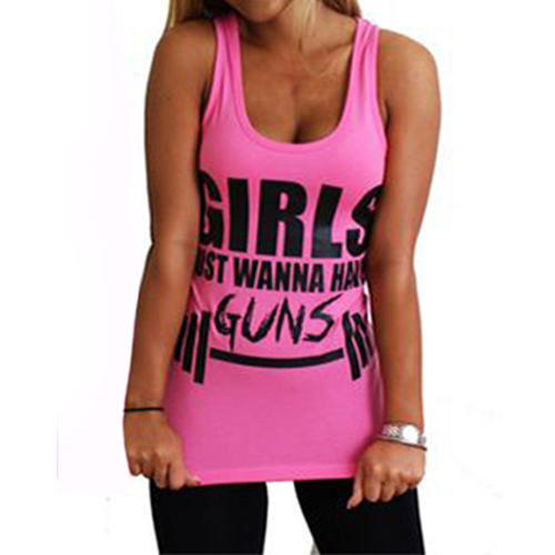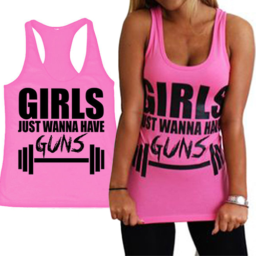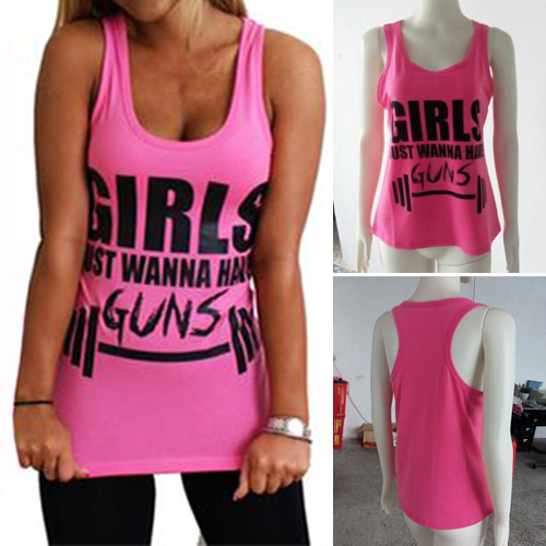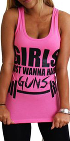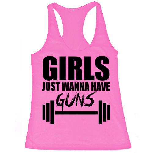 This tank is printed with "GIRLS JUST WANNA HAVE GUNS" and there is a graphic dumbbell on it,