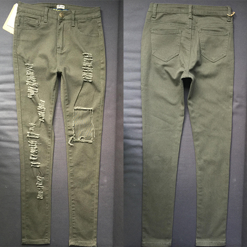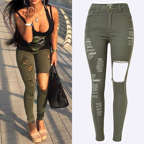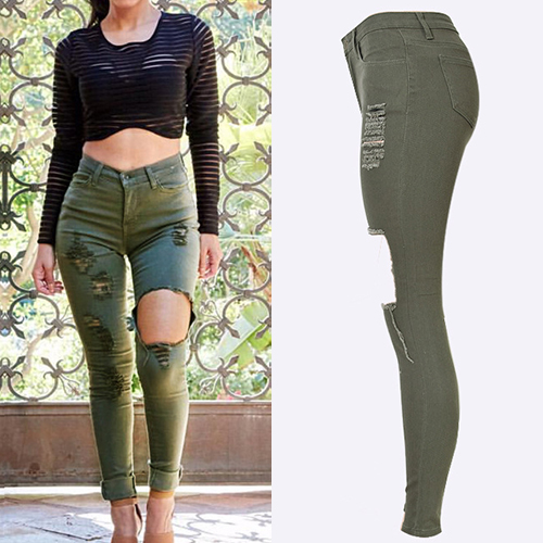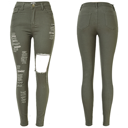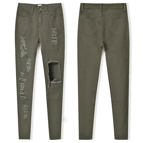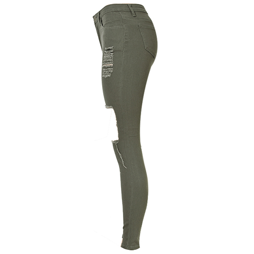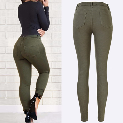 The color of this pair of skinny jeans is army green and it is ankle length. Moreover, this pair of jeans is buttoned