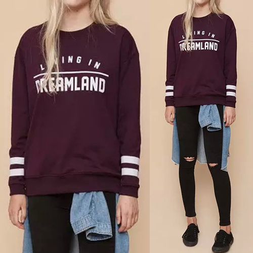 soft fabric, accompanied with letters printed, long sleeve, round neck and striped spliced design, this