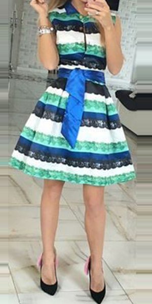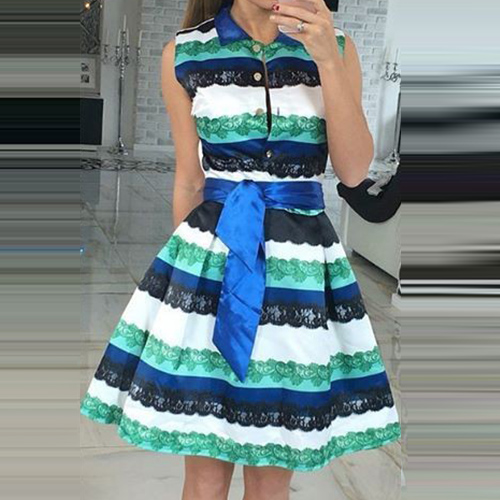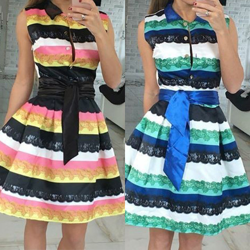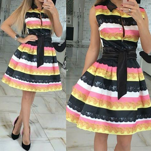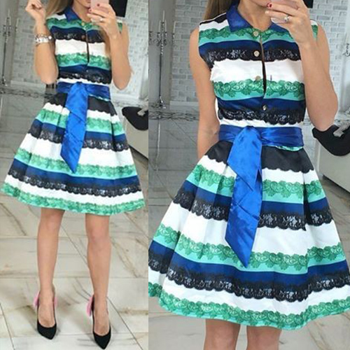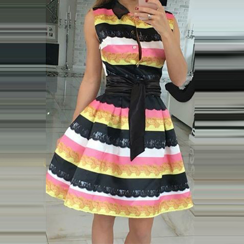 Stylish Striped Printed Lapel Sleeveless Gathered Waist Dress