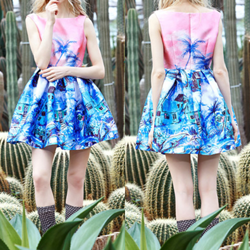 Beautiful houses and trees printed let this dress more attractive. The combination of boat neck