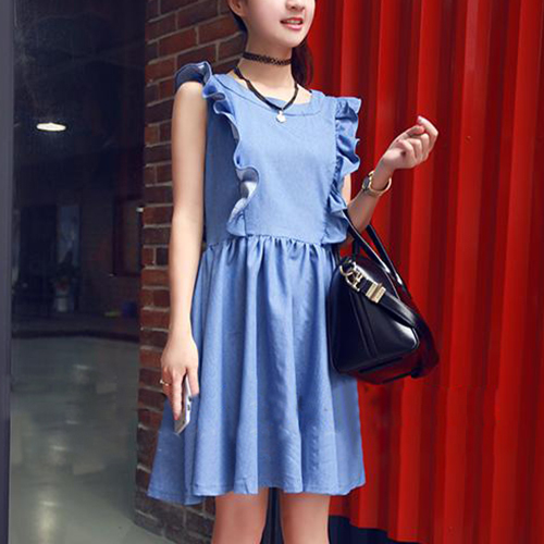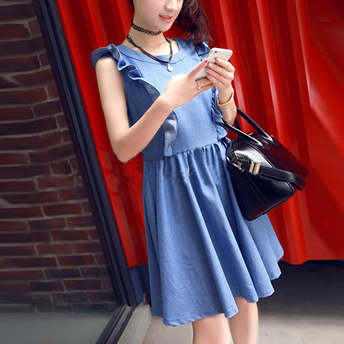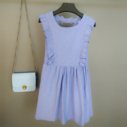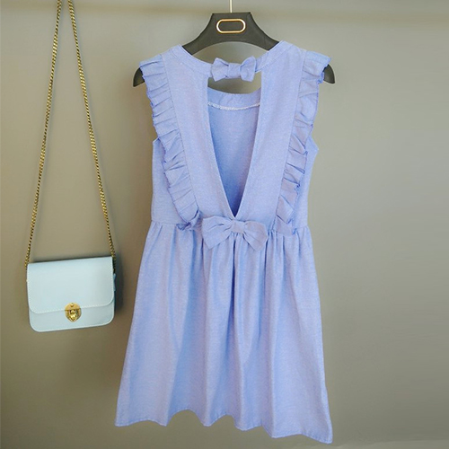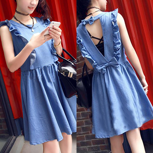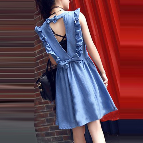 Sweet Bowknot Backless Flouncing Sleeveless Round Neck Denim Dress