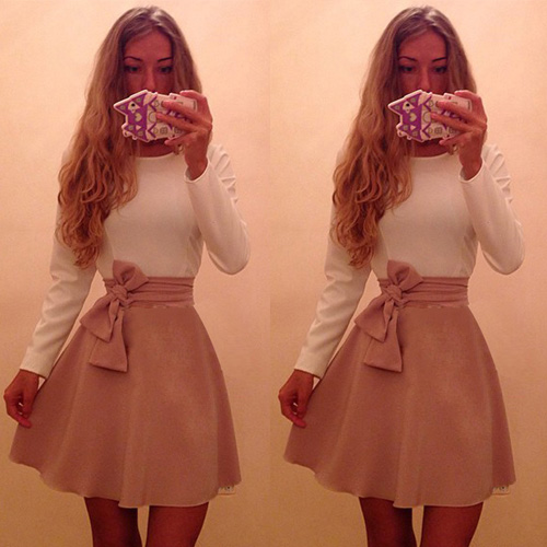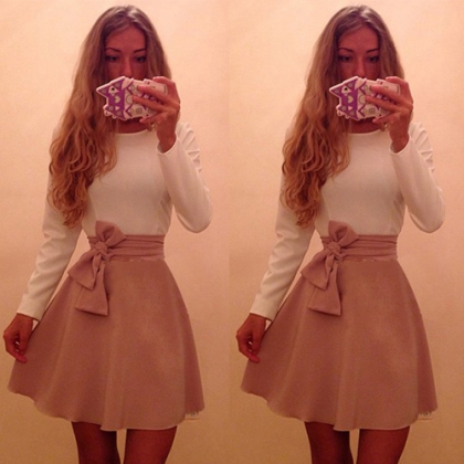 waist part with bowknot and flouncing design,sweet and elegant. Long sleeve,round neck