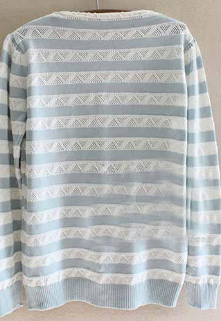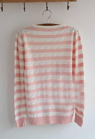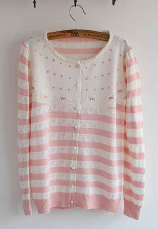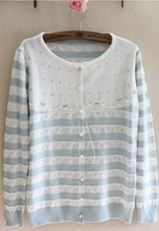 Wanna change your style into a sweet one? Consider this fresh cardigan. Features the dot and stripe print. Classical and retro. The lace spliced make it looks fashion and unique. Floral crochet add sweet and elegant element to the cardigan. Button placket. Long sleeve. Ribbed trim. In it. you will feel comfortable and warm. Wanna one? Have one.