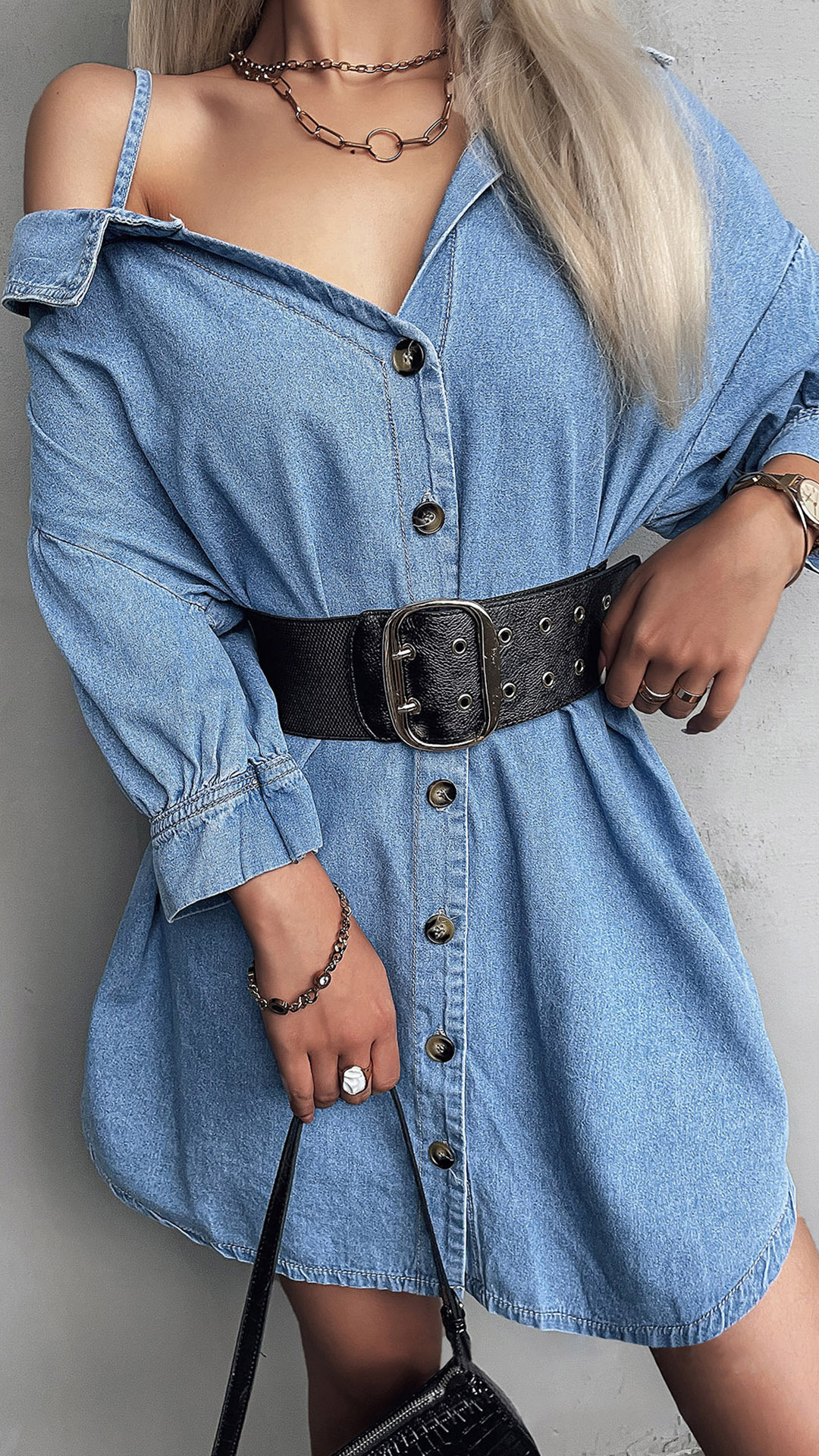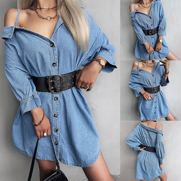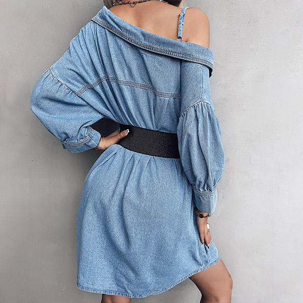 Sweet Off Shoulder 3/4 Sleeves Front Button Denim Cami Dress