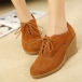 It features a lace-up front,a rounded toe,suede upper as well as comfortable plaid-patterned textile sock lining with lightly padded footbed,durable gum sole with flower patterns,sleek stable wedge heel.It is an instant classic,which is designed for girls who hope to look tall but not wear stilettos.