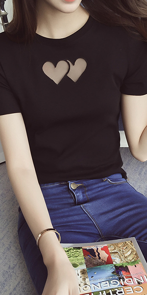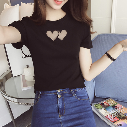Heart-shaped gauze spliced design, sweet and romantic. Solid color style with round neck and short