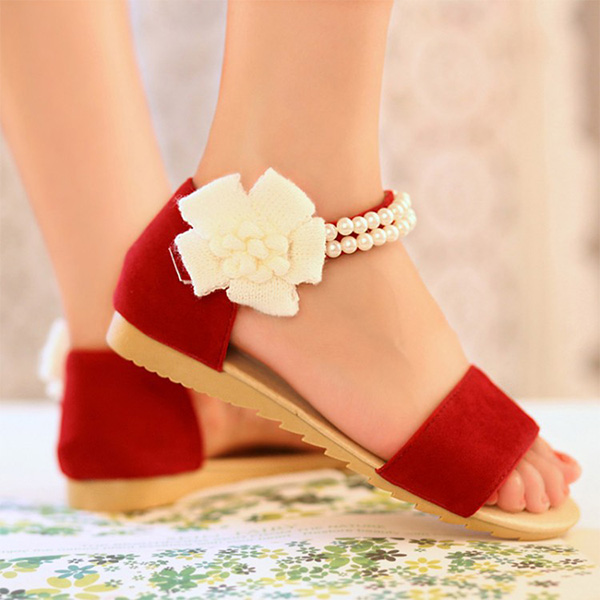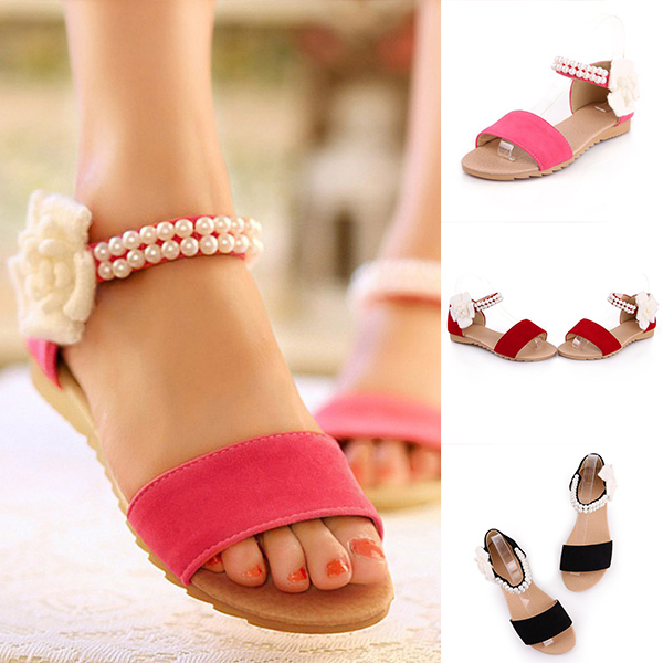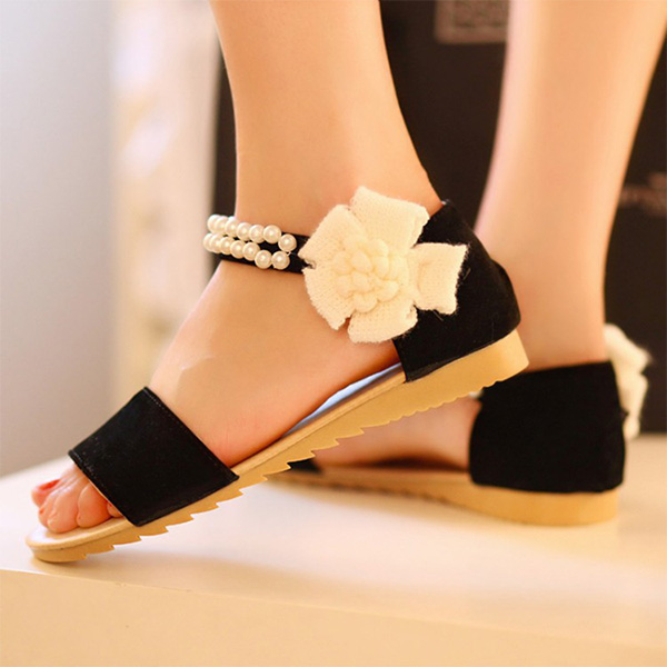 Sweet Style Flat Heel Pearl Inlaid Open-toe Sandals