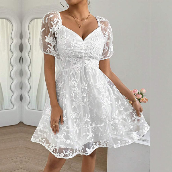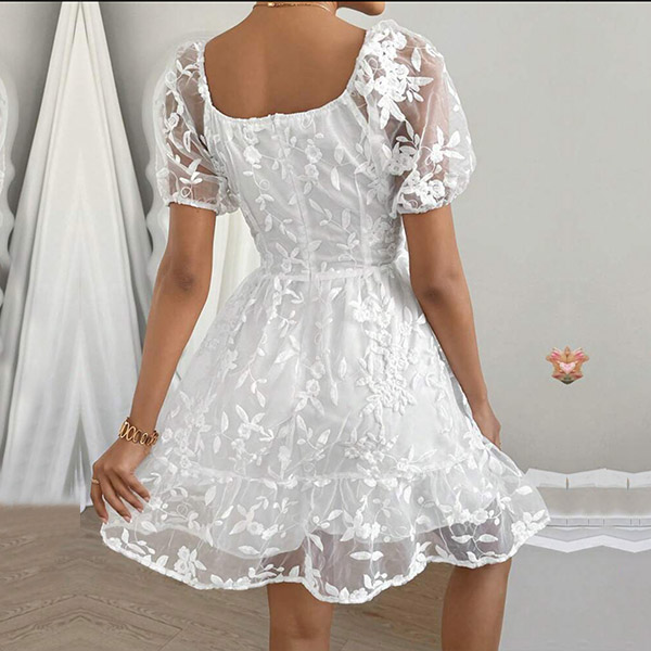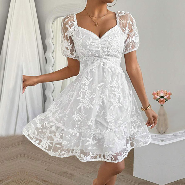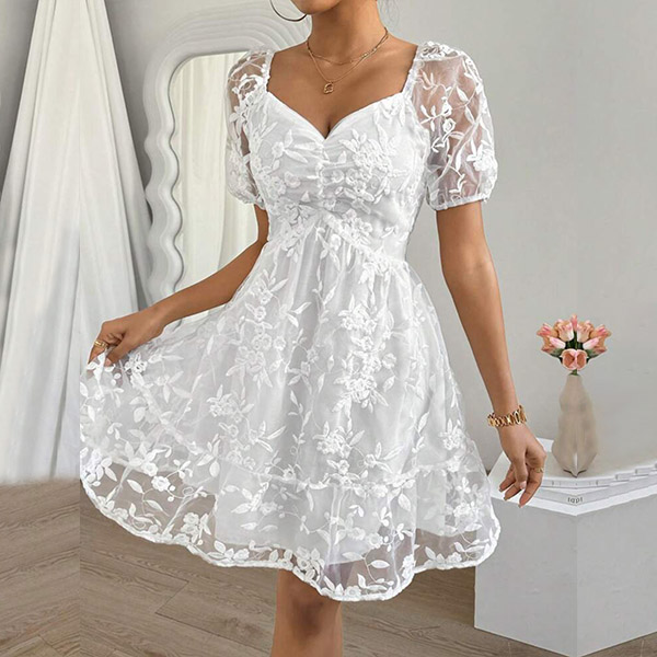 Sweet Style Floral Jacquard Gauze Spliced Sweetheart Neckline Short Sleeve Mini Dress
