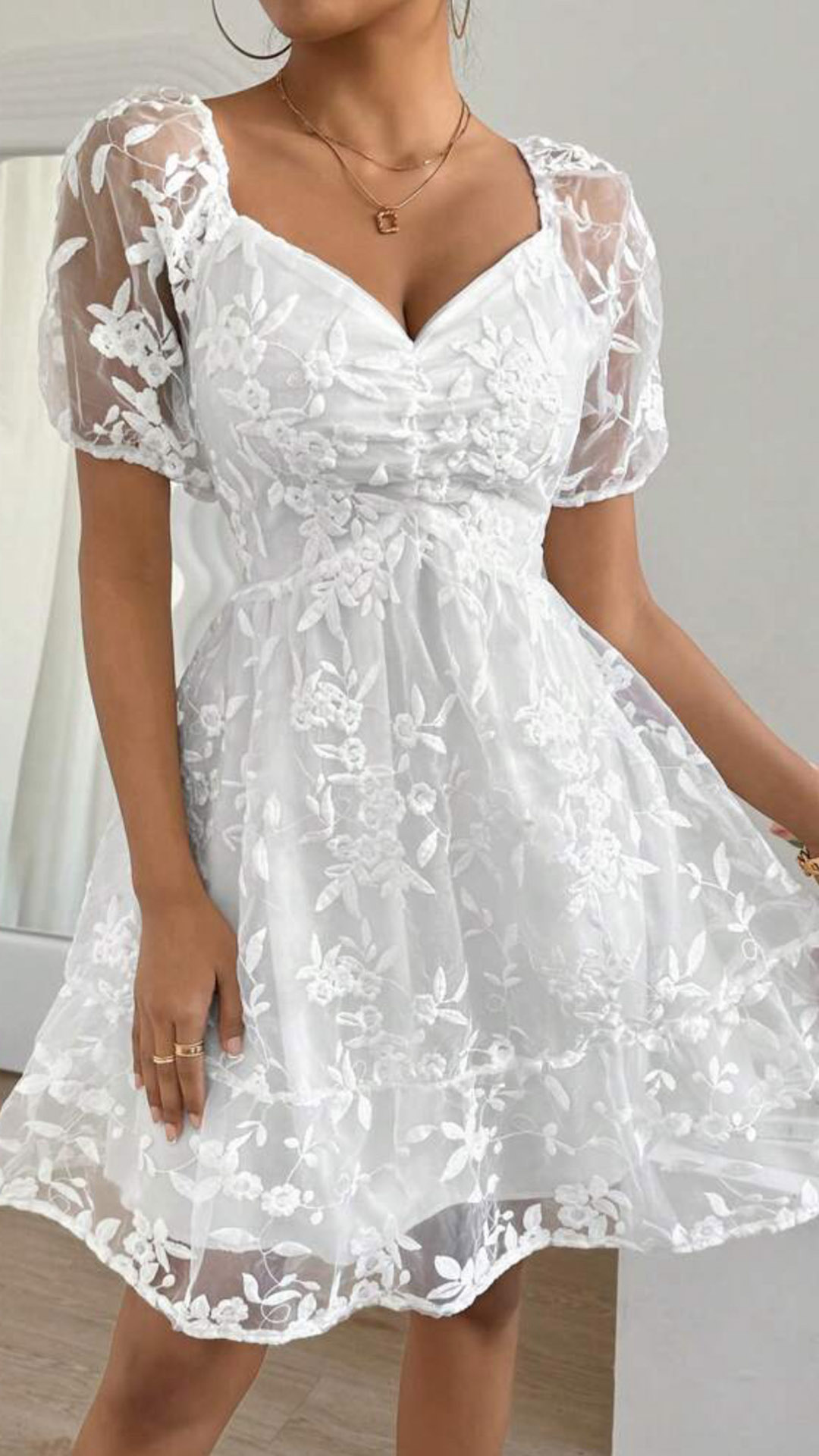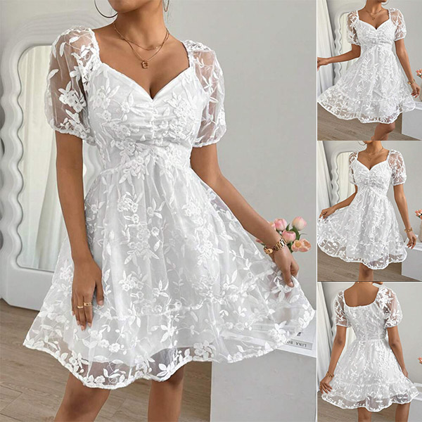 This mini dress features a sweetheart neckline, short sleeve and mini length. The floral jacquard gauze spliced detailing on this dress adds a whimsical and delightful touch. It is a charming and feminine piece that combines sweet details with a flattering silhouette.