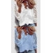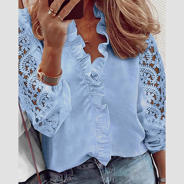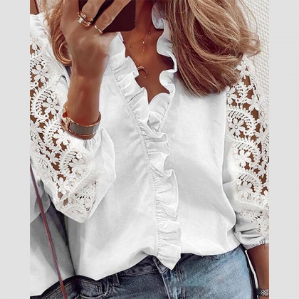 Compared with your other simple and formal shirts,this piece can help you gain more eyes. What makes this piece look so attractive? It owes to the hollow out lace long sleeve,v-neck and ruffle details. When matching with a jeans or skirt,you can look fashionable and charming enough!