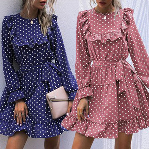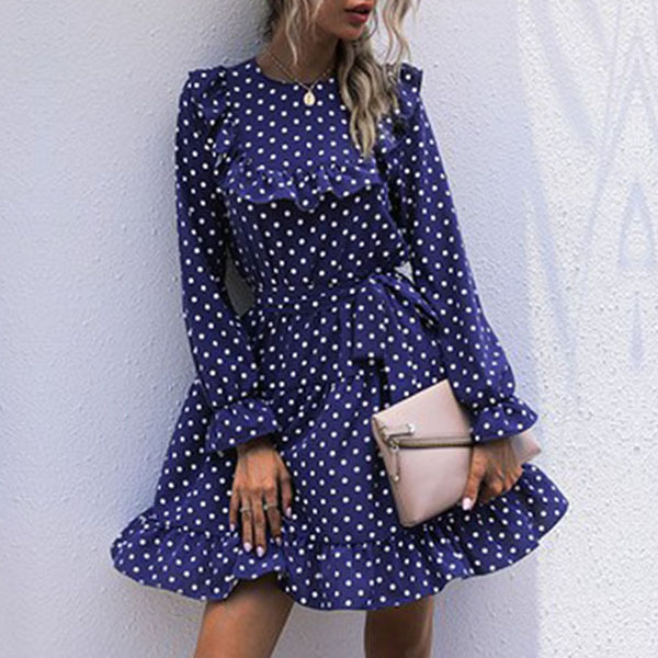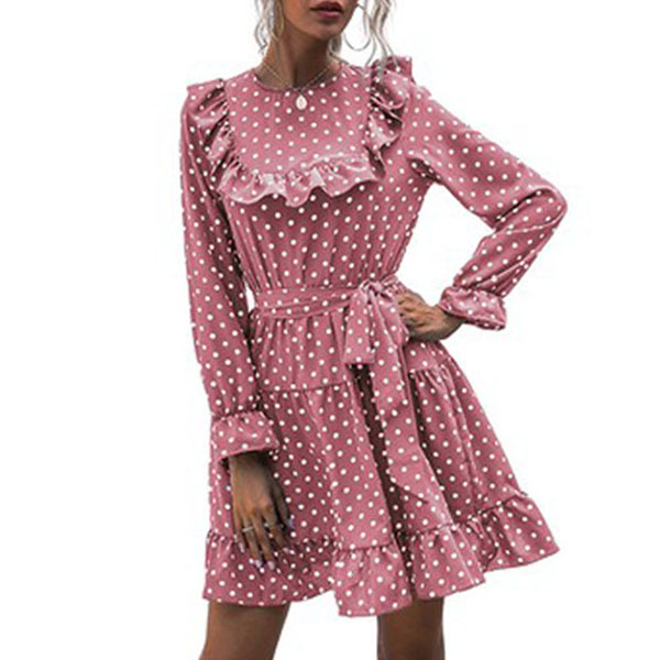 Sweet Style Long Sleeve Round Neck Dots Printed Ruffle Dress