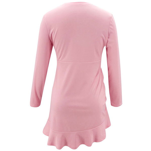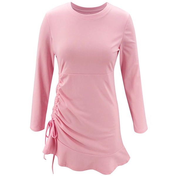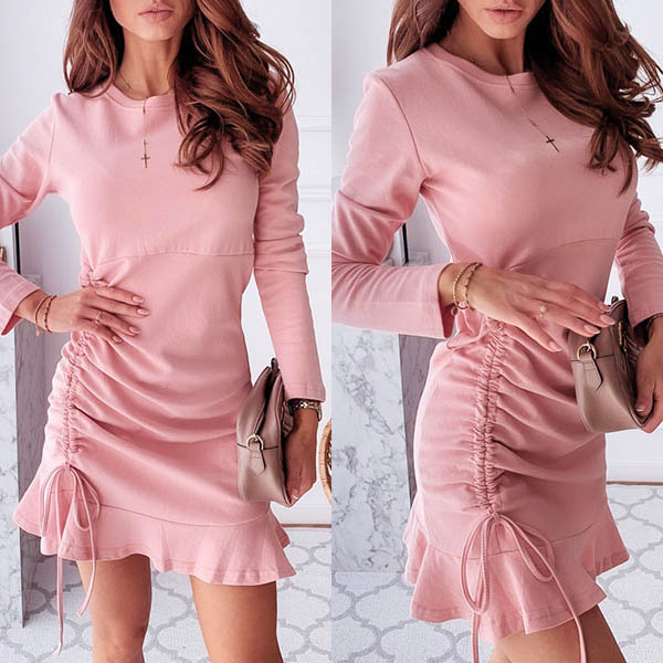 This dress boasts a sweet pink tone,finished with long sleeve,round neck and ruffle hem design,which can enhance your feminine appeal. Moreover,the side drawstring design will make this piece look more attractive. Save this beautiful dress for your night dating and weekend out.