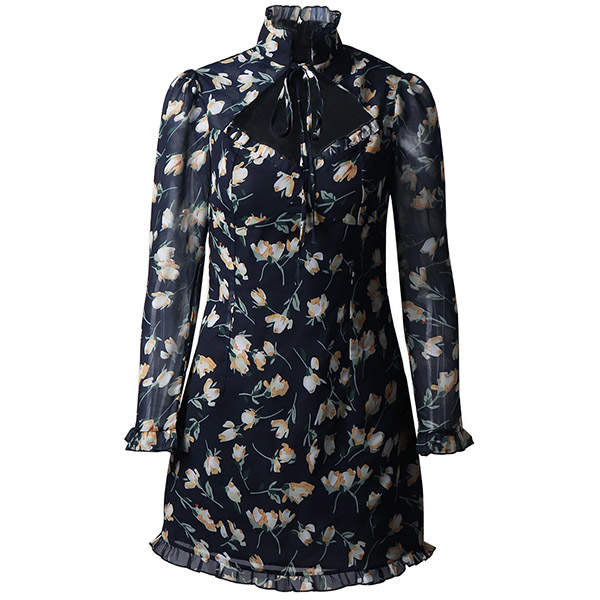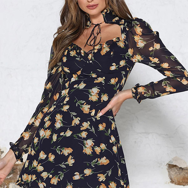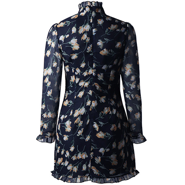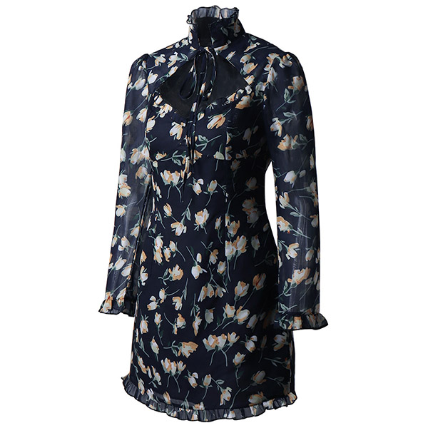 Greet your wonderful days in stunning style with this dress. Its vibrant floral print details make this piece look so eye-catching,while the ruffle stand collar and hollow out design at the neckline will offer you a more alluring look. Any girl can look effortlessly charming and beautiful in this dress.