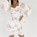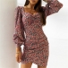 Sweet Style Long Sleeve Square Collar Irregular Hem Slim Fit Printed Dress