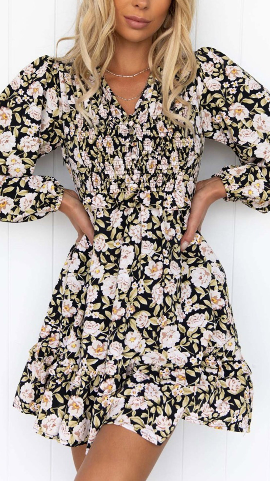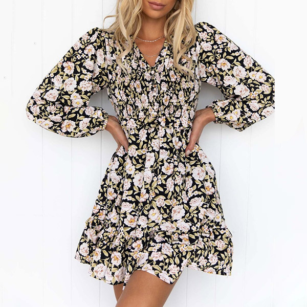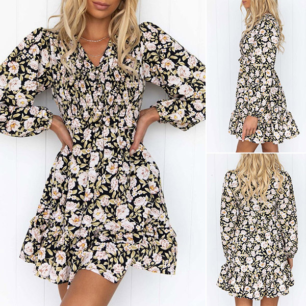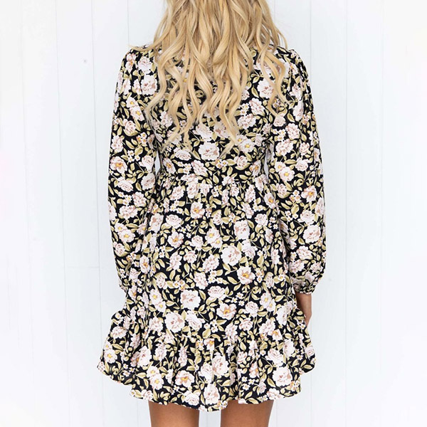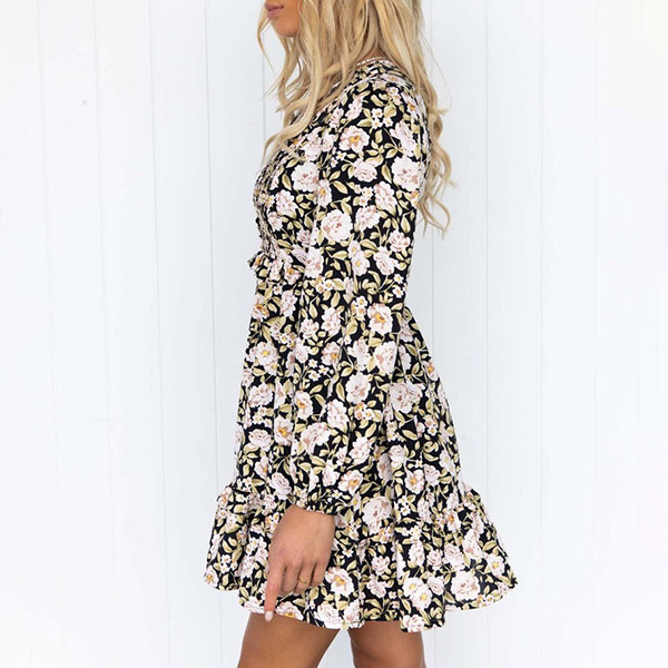 Make your simple and dull wardrobe more complete by adding this printed dress. Its vibrant floral print details make this piece look so eye-catching,while the deep-neck and ruffle hem design can lend you a dash of sweet and flirty vibes. No matter for your daytime out to night dating,this dress can be your perfect choice.