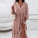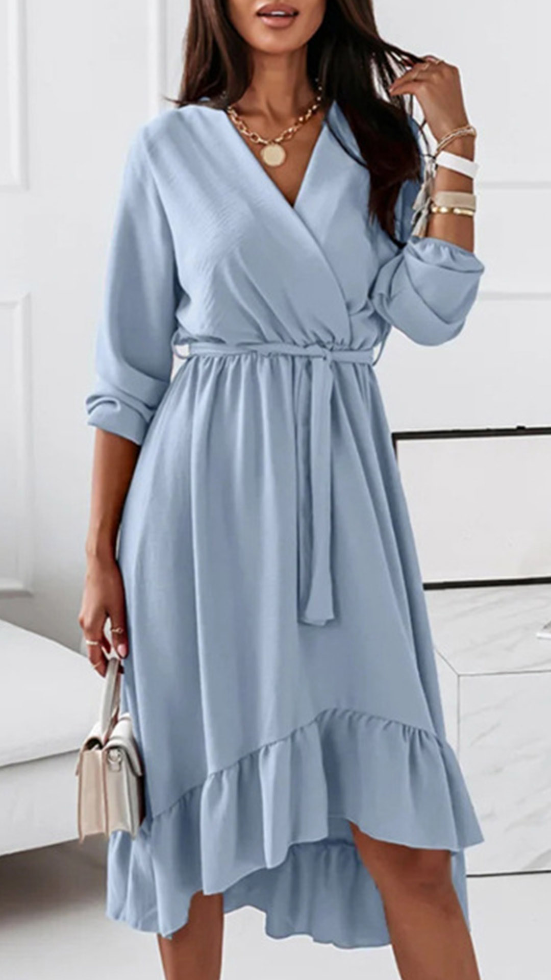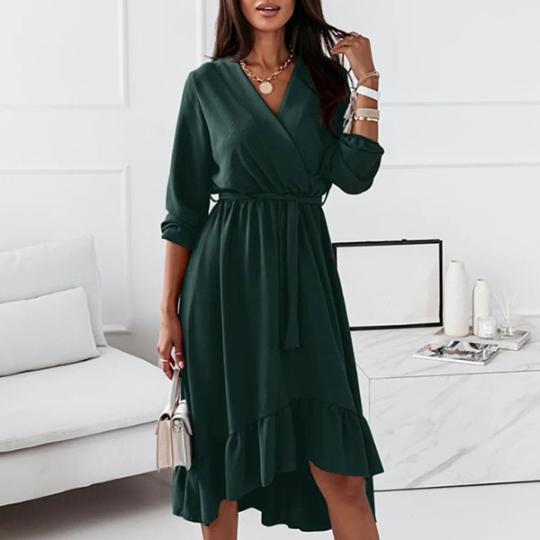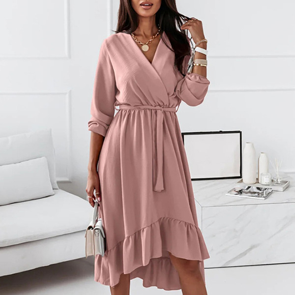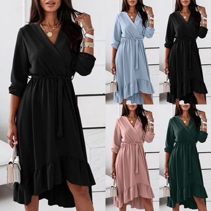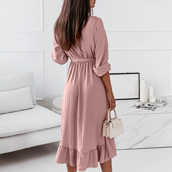 Wanna a sweet yet stylish daily look? Then you can just have a try this dress. It comes with a solid color,the v-neck and ruffle hem design can lend you some sassy yet flirty vibes. And the tie-belt design at the waist part can better showcase your waistline. It is perfect fit for different occasions.