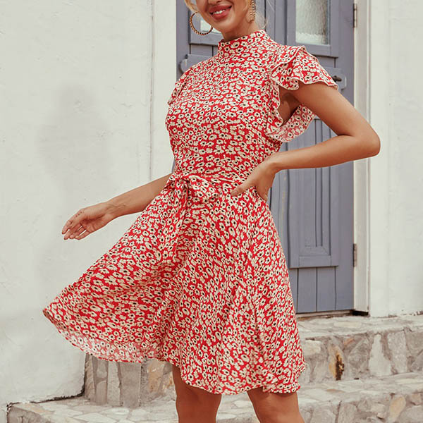 Sweet Style Lotus Sleeve Mock Neck Printed Dress