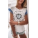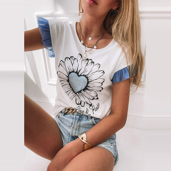 Sweet Style Lotus Sleeve Round Neck Heart Flower Pattern Loose T-shirt