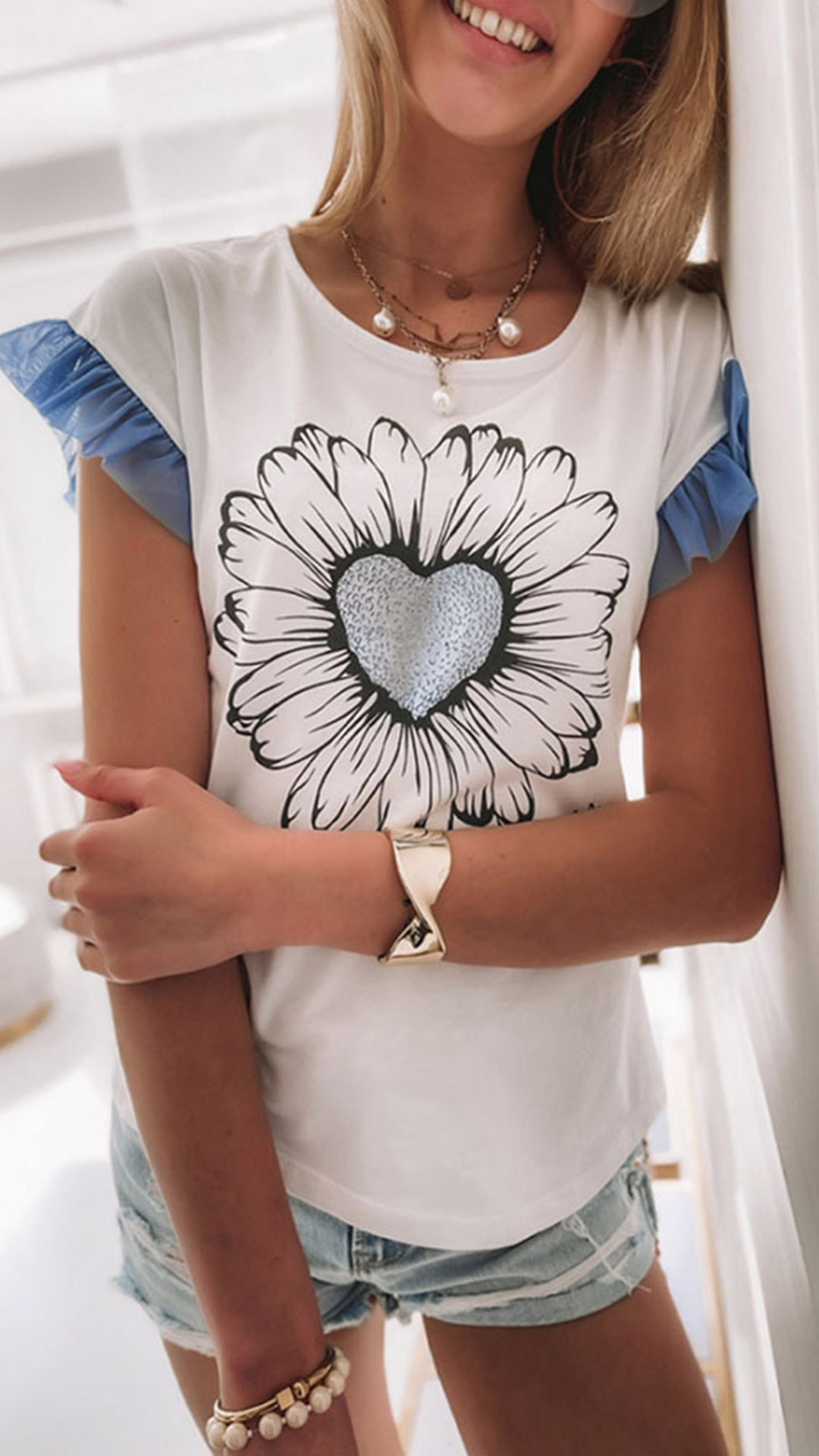 A perfect combination of sweet,stylish and cozy vibes,this t-shirt is yearning for a place in your wardrobe. The lotus sleeve,heart flower pattern design make it look so distinctive and attractive,while its soft and breathable fabric and loose silhouette design can give you a comfortable day. Perfect fit for your casual days.