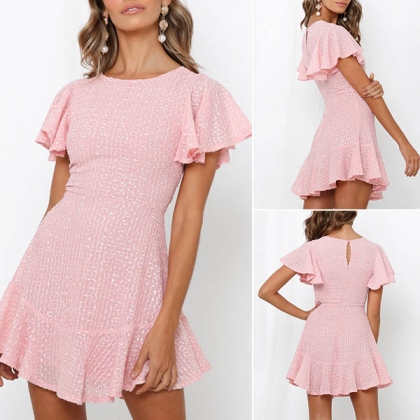 Sweet Style Lotus Sleeve Round Neck Ruffle Hem Dress