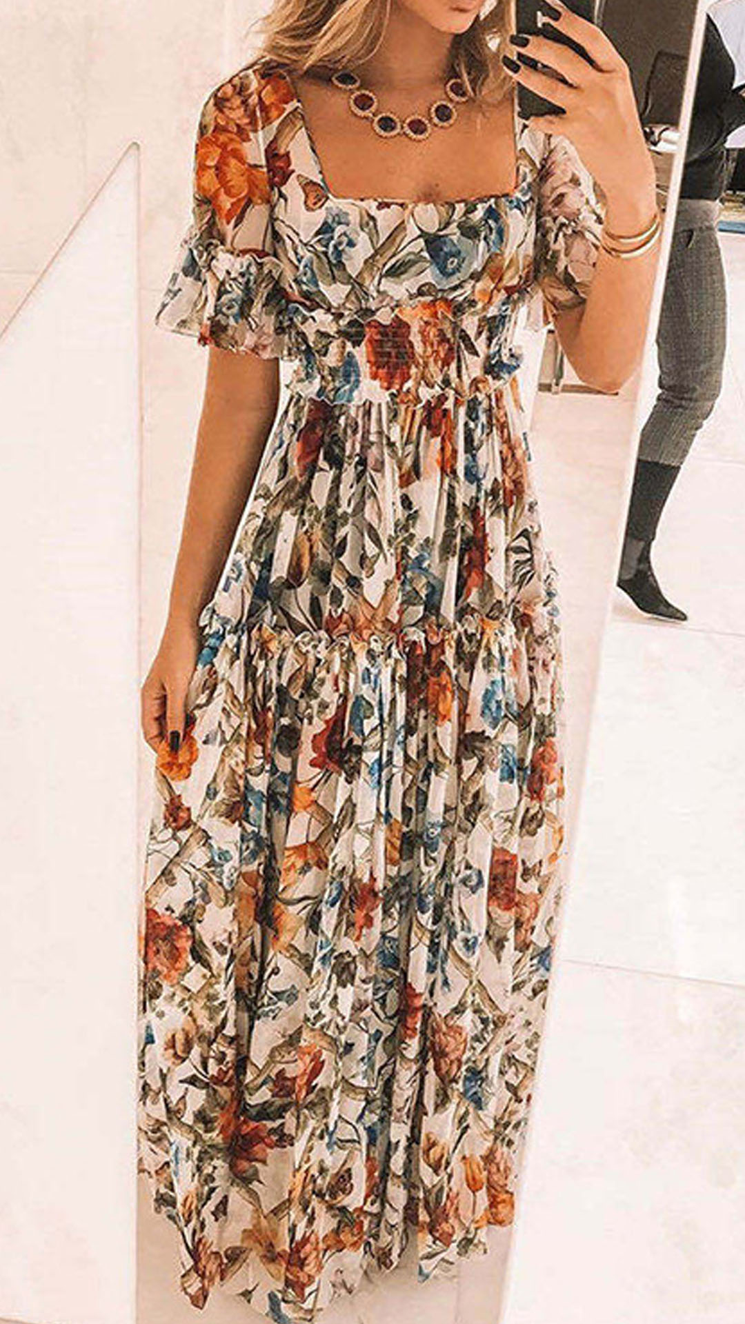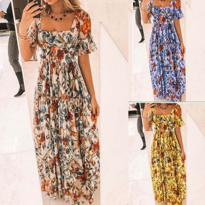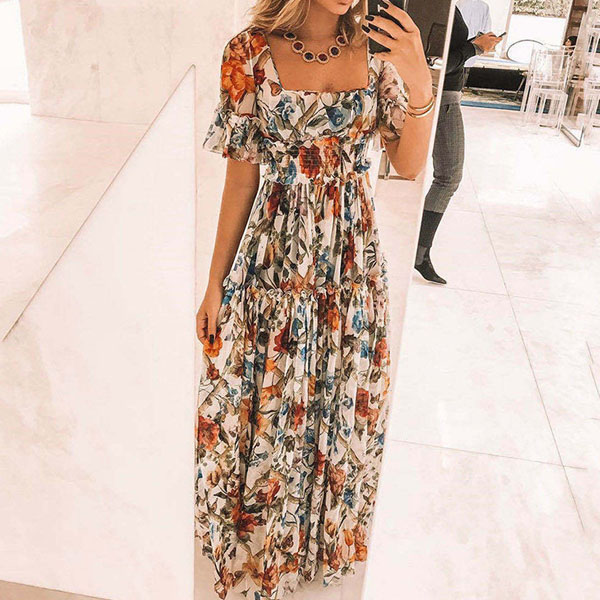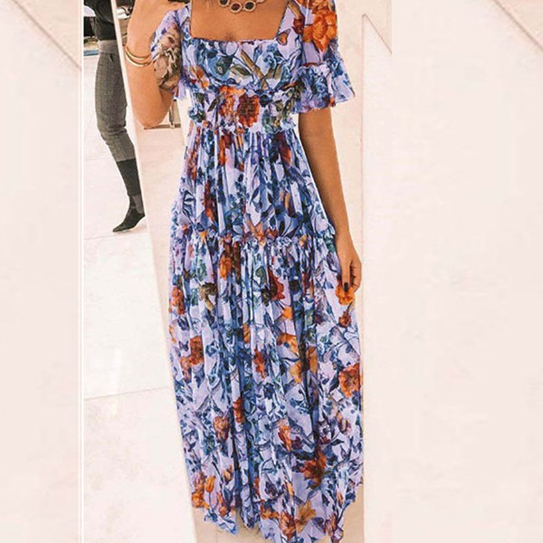 From your summer garden parties or weekend beach trips,this beautiful printed dress can give you an easy transition. Its vibrant floral print details make this piece look so eye-catching,while the lotus sleeve and square collar design can lend you a dash of sexy and flirty vibes. Meanwhile,the high waist and maxi length design can showcase your slender figure. So why not take interest in it?