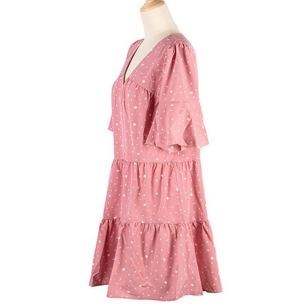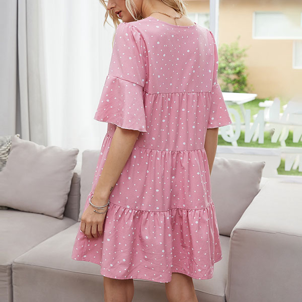 Sweet Style Lotus Sleeve V-neck Dots Printed Dress