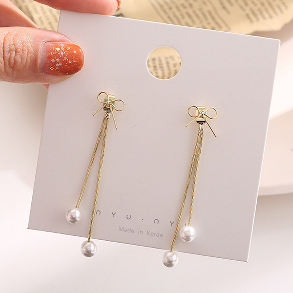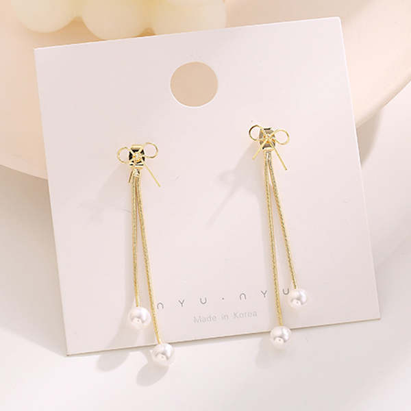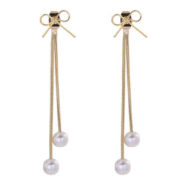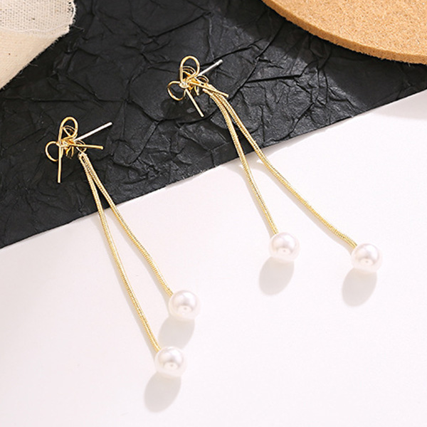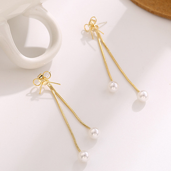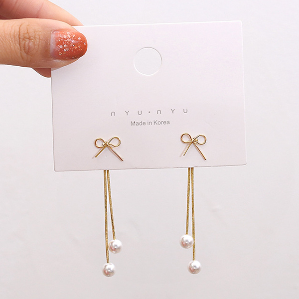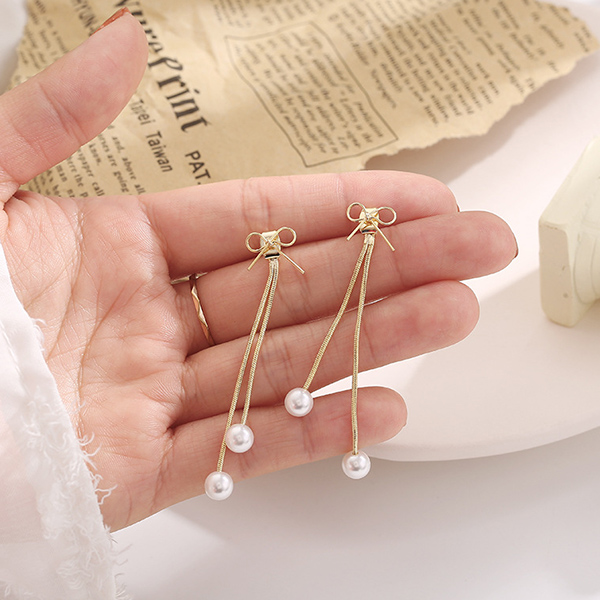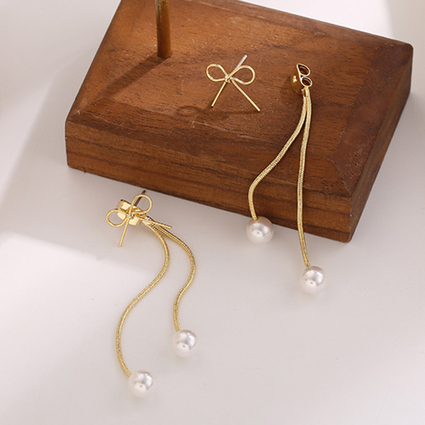 This pair of earrings is inlaid with pearl details,which can easily enhance its charm. Moreover,the bow-knot design can lend you a dash of sweet and stylish vibes. Enrich your accessory box with this pair of earrings.