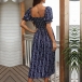Sweet Style Puff Sleeve Square Collar High Waist Slit Hem Printed Dress