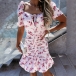 Sweet Style Puff Sleeve Square Collar Ruffle Hem Slim Fit Printed Dress