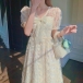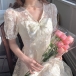 Sweet Style Puff Sleeve V-neck High Waist Lace Princess Dress