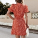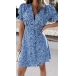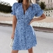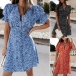Sweet Style Puff Sleeve V-neck High Waist Printed Dress