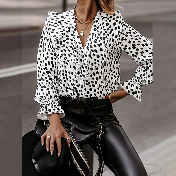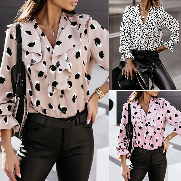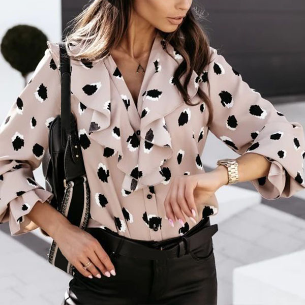 This shirt that exudes sweet and stylish vibes is worth to arouse your attention. Its chic printed details make this piece look more eye-catching,while the v-neck and ruffle design will further enhance its entire charm. Try to match with your favourite bottoms to achieve for a charming and beautiful look.