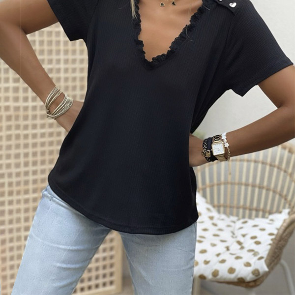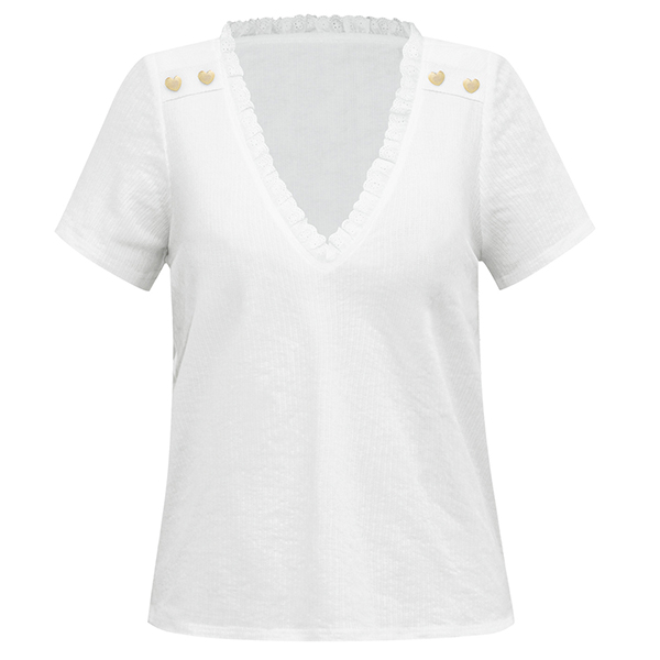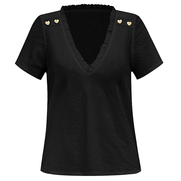 Crafted from soft and breathable fabric,with short sleeve and heart button details at the shoulder part,this t-shirt can ensure you an all-day comfort. Meanwhile,the ruffle v-neck design will make this piece look more attractive. All-match design allows to be matched with different style bottoms.